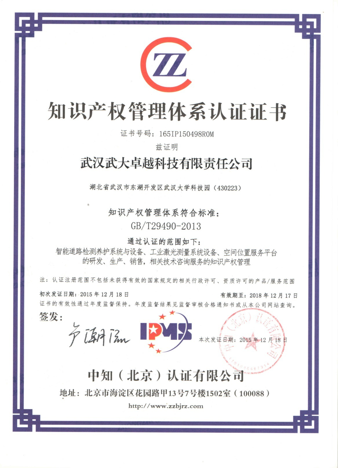 評(píng)審組對(duì)我公司近兩年來(lái)持續(xù)貫徹落實(shí)《企業(yè)知識(shí)產(chǎn)權(quán)管理規(guī)范》所做出的工作給予充分肯定。2015年12月18日,卓越科技順利獲得了由中知(北京認(rèn)證有限公司頒發(fā)的知識(shí)產(chǎn)權(quán)管理體系認(rèn)證證書(shū),成為全國(guó)首批通過(guò)《企業(yè)知識(shí)產(chǎn)權(quán)管理規(guī)范》認(rèn)證企業(yè)。
