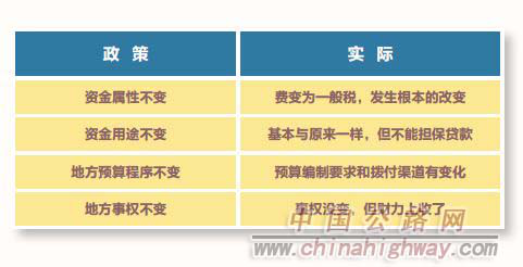 ??在開征燃油稅以前,我國(guó)公路養(yǎng)護(hù)資金大都來(lái)自于公路養(yǎng)路費(fèi)。進(jìn)行燃油稅費(fèi)改革時(shí),交通部門與財(cái)政部門就燃油稅達(dá)成了“4個(gè)不變”的共識(shí):資金屬性不變、用途不變、預(yù)算程序不變、事權(quán)不變。然而,在實(shí)際執(zhí)行過(guò)程中,“4個(gè)不變”都發(fā)生了變化。燃油稅不再是部門資金,它變成了一種消費(fèi)稅——燃油稅的全名為燃油消費(fèi)稅。它既不是被普遍理解成的燃油附加,也不是專門給交通行業(yè)使用的——從“費(fèi)”變成“稅”,它的性質(zhì)發(fā)生了根本的變化。令人稍感欣慰的是,當(dāng)初財(cái)政部承諾的資金用途不變,目前看來(lái)基本屬實(shí)。但是,這項(xiàng)資金從費(fèi)變成稅后,再也不能進(jìn)行融資擔(dān)保,使得公路發(fā)展資金的來(lái)源大大收窄。“預(yù)算程序不變”,這是根本不可能實(shí)現(xiàn)的。以前養(yǎng)路費(fèi)用于養(yǎng)路,不需要編制預(yù)算?,F(xiàn)在養(yǎng)護(hù)資金納入公共財(cái)政之后,必須編制預(yù)算——資金渠道發(fā)生了變化。