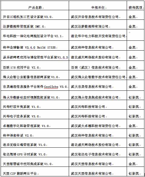 ?????本次湖北展團(tuán)著重突出了名企、名品對(duì)我省市中國(guó)軟件名城發(fā)展提升所起到的積極作用。在2014年北京軟博會(huì)金獎(jiǎng)和創(chuàng)新獎(jiǎng)評(píng)選過(guò)程中,湖北展團(tuán)共報(bào)送19件產(chǎn)品和信息化解決方案,最終有8項(xiàng)榮獲金獎(jiǎng),9項(xiàng)榮獲創(chuàng)新獎(jiǎng)。具體如下:?